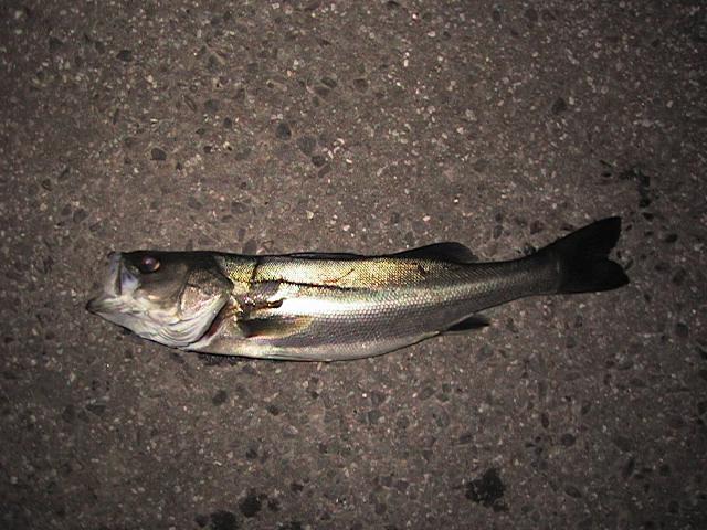 人が多い。多すぎる。 まぁ、自分もその中の一人だから文句は言えない。 目当てのポイントは既に占拠されている。 おもいっきし、はずれの場所で始める。 一時間が過ぎる...音沙汰無し。 二時間が過ぎる...音沙汰無し。 お目当てのポイント付近では釣れているようだ。悔しい。 「今日はもしかしてボーズか?!!」と、嫌な予感が強くなった頃ヒット。 しかし、様子が変だ。変なえら洗いをする。引き寄せると何と「ボラ」... トホホ... 三時間が過ぎる...ヒット!! 今度はまさにシーバスのえら洗いだ! 軽くあしらってずり上げたのは48cm。超銀ぴかだ! サイズ的には小さいが、とにかく一安心。 その後は予定の時間ともなったし、あまり粘れずに終了となった。 |