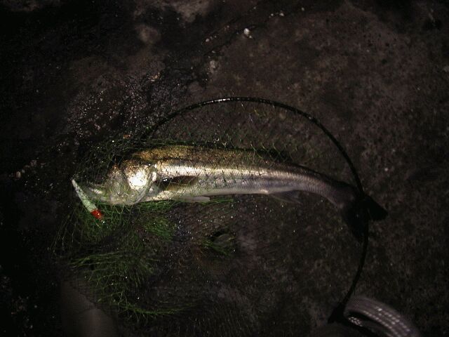 (釣行記) 本命のYに行く前に時間合わせの釣行。 アングラーはほとんど無し。 程よい濁りと適度な下げの流れ、釣れそうな予感。 ボラが盛んに跳ねている。 最初、ラパラで探ったが反応が無いのでフローティングで攻める。 すると、かすかなバイトが多発する。ボラか? ルアーの回りでじゃれているような感じだ。 流れにのったルアーがターンしたところでかすかな、しかし引っかかるようなバイト。 軽く聞き合わせ。するとぐんと重みが乗り走る。ここで一発本合わせ。 フッキング成功。久しぶりの引きを楽しむ。手前では下への何度かの突っ込みをドラグがかわす。 無事タモに収まったのは、少し痩せているがナイスサイズの69cmのシーバス。 2000年初ゲット。まずは一安心。 その後、ショートバイト多発するが乗せられず、代わりに60cmクラスのボラを2ゲット^^; この冬楽しみなポイントである。 その後の本命Yは撃沈した事を付け加えておこうーー; |